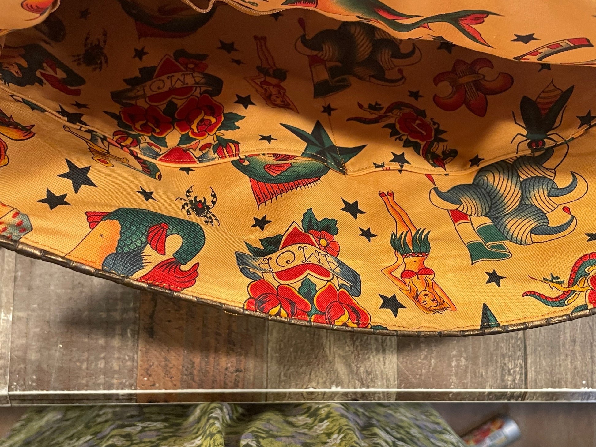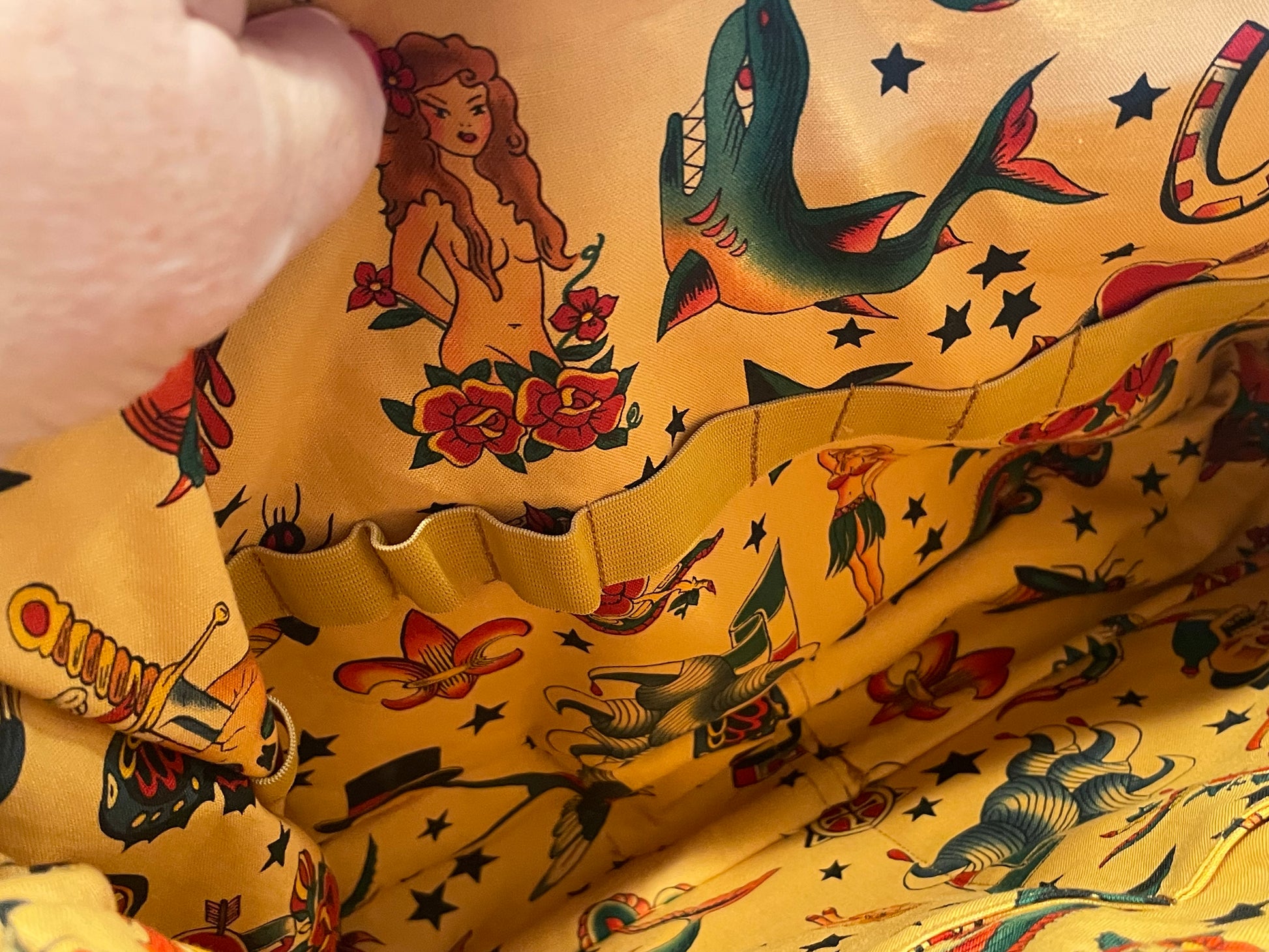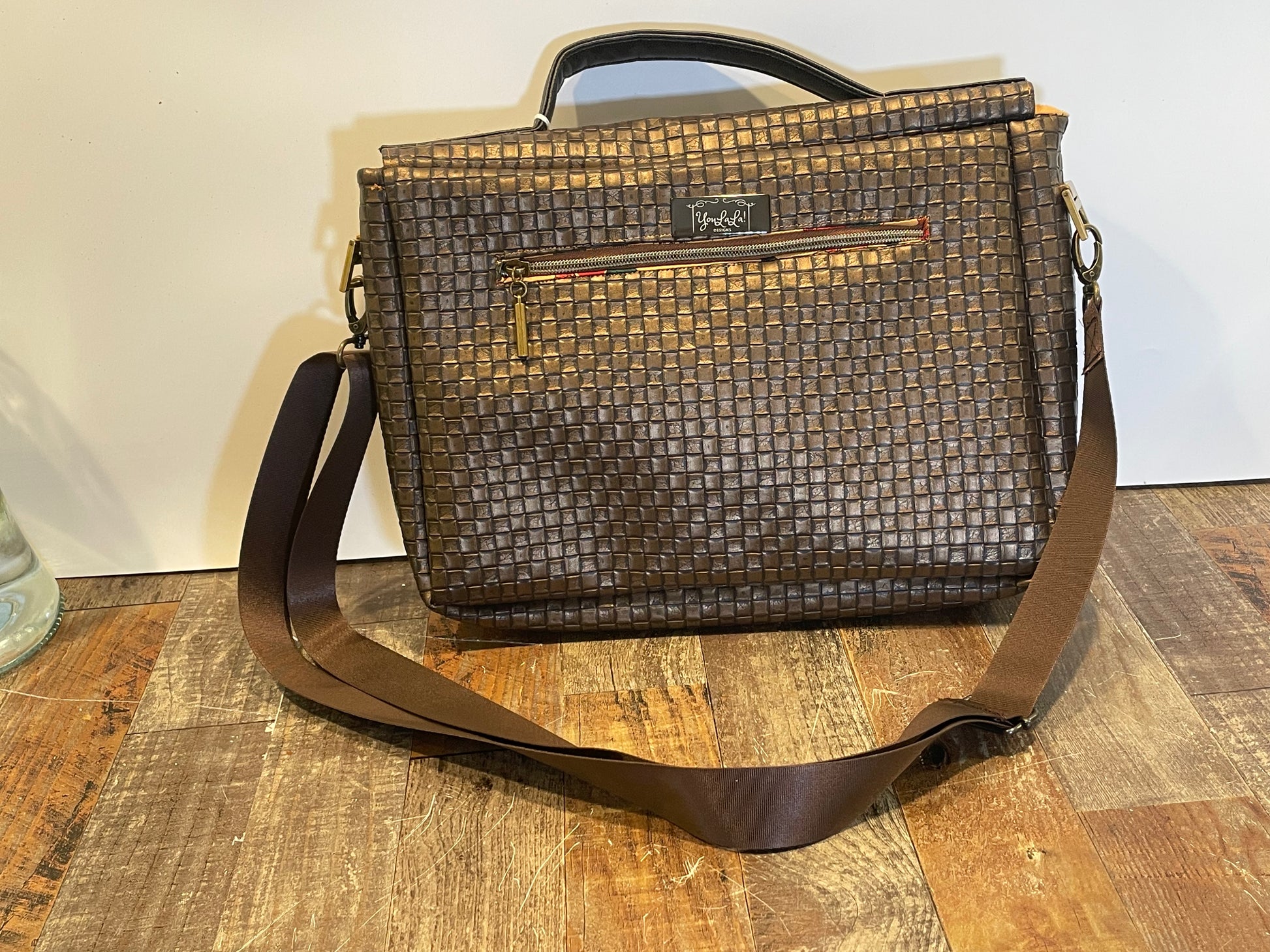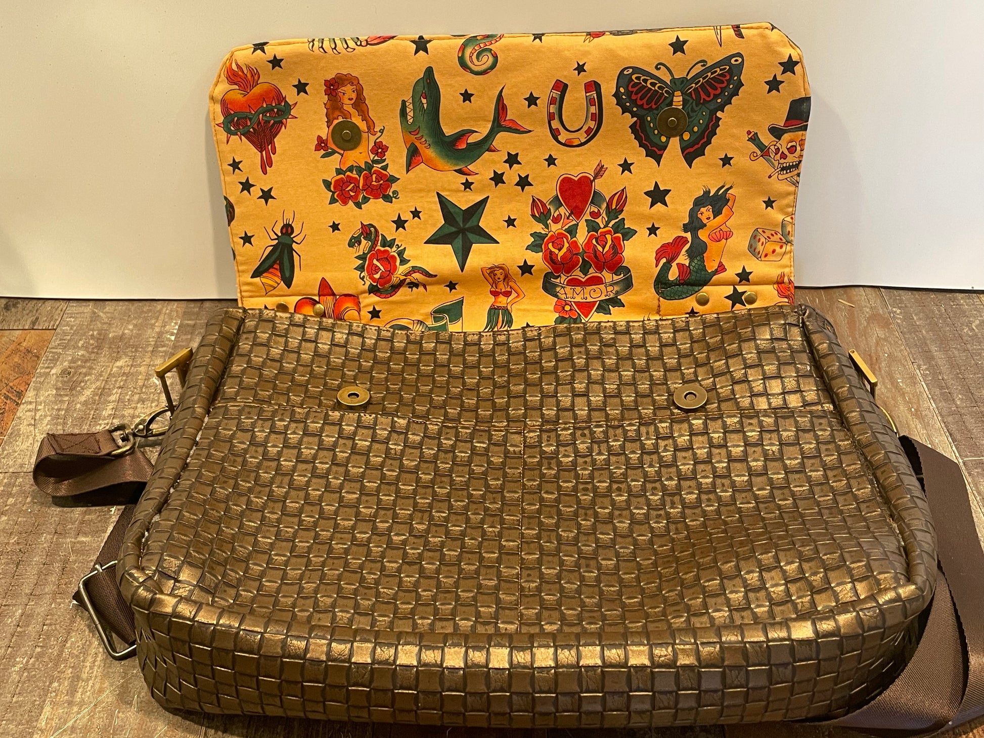 Bronze vegan leather in a textural woven pattern. Adjustable soft chocolate brown strap and antique bronze hardware. Inside, and pockets feature designer Alexander Henry's Tattoo Tea fabric. But this bag is more than just lewks: it's storage, storage storage! Outside, there's a back zipper pocket in the back, and a covered dual slip pocket in front. Inside, there's two slip pockets, divided elastic stap for pens, etc. and enough room for a standard laptop.