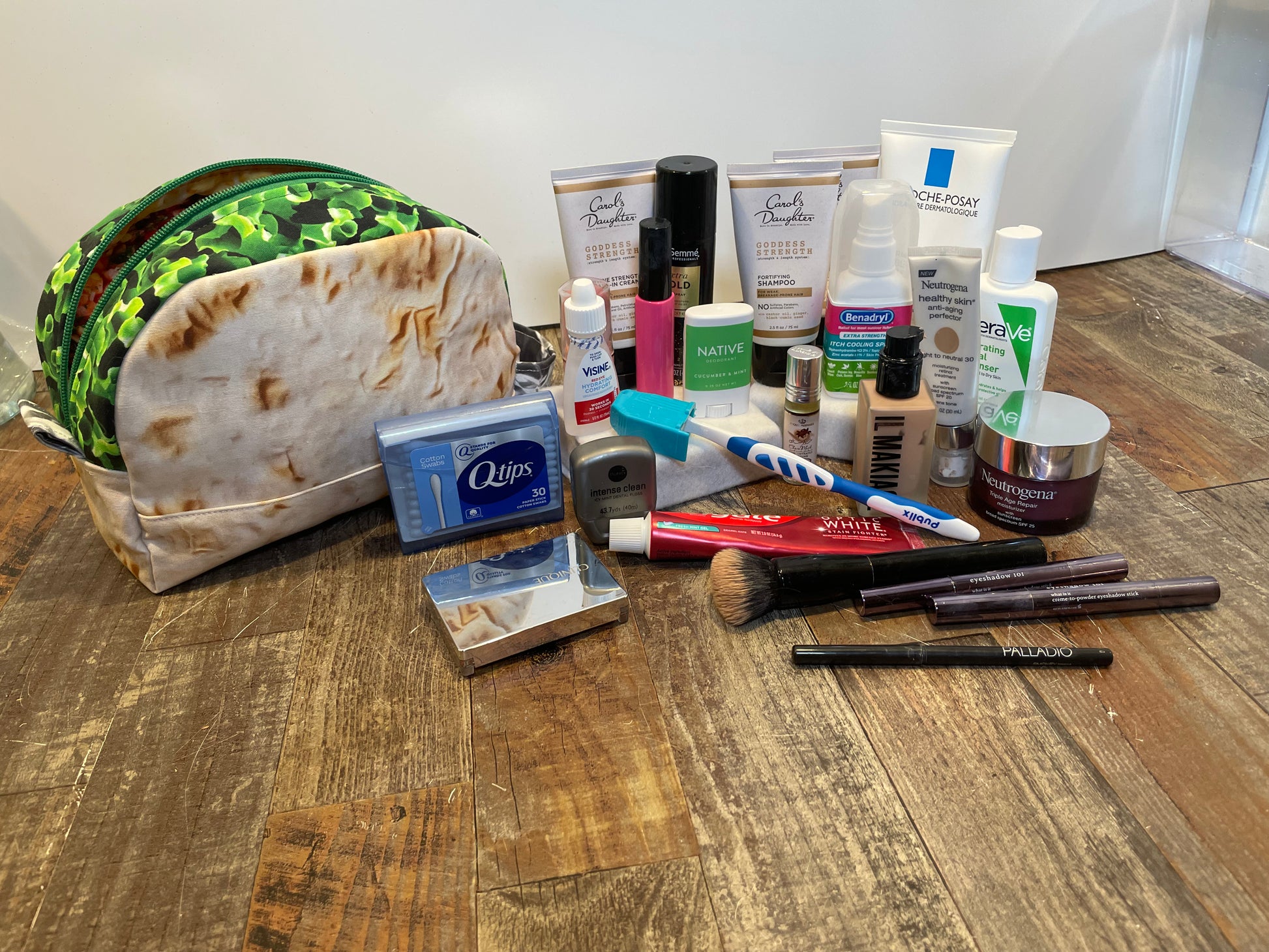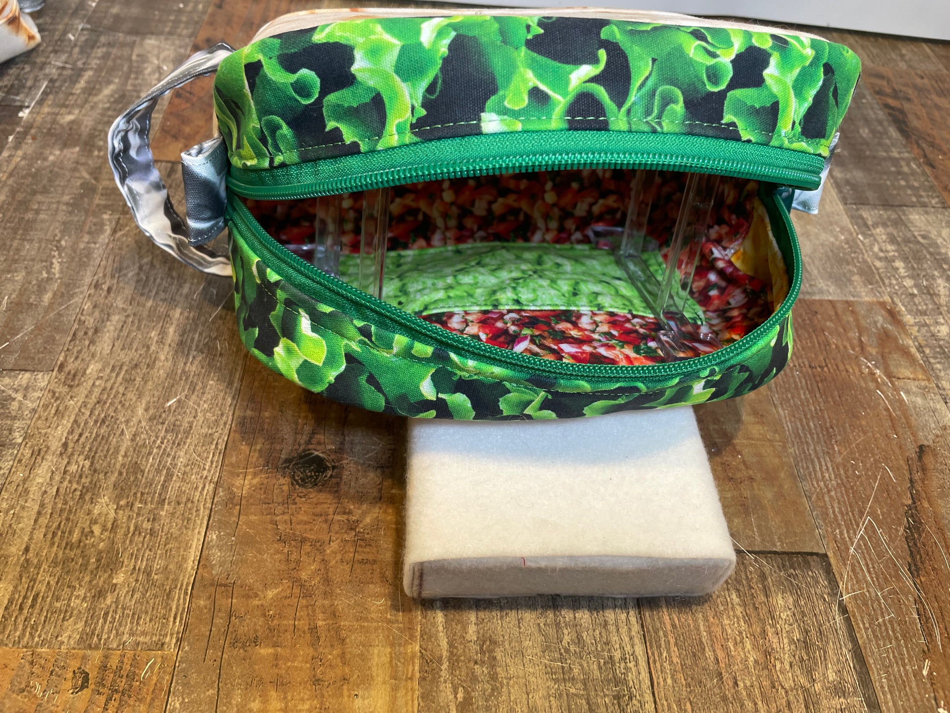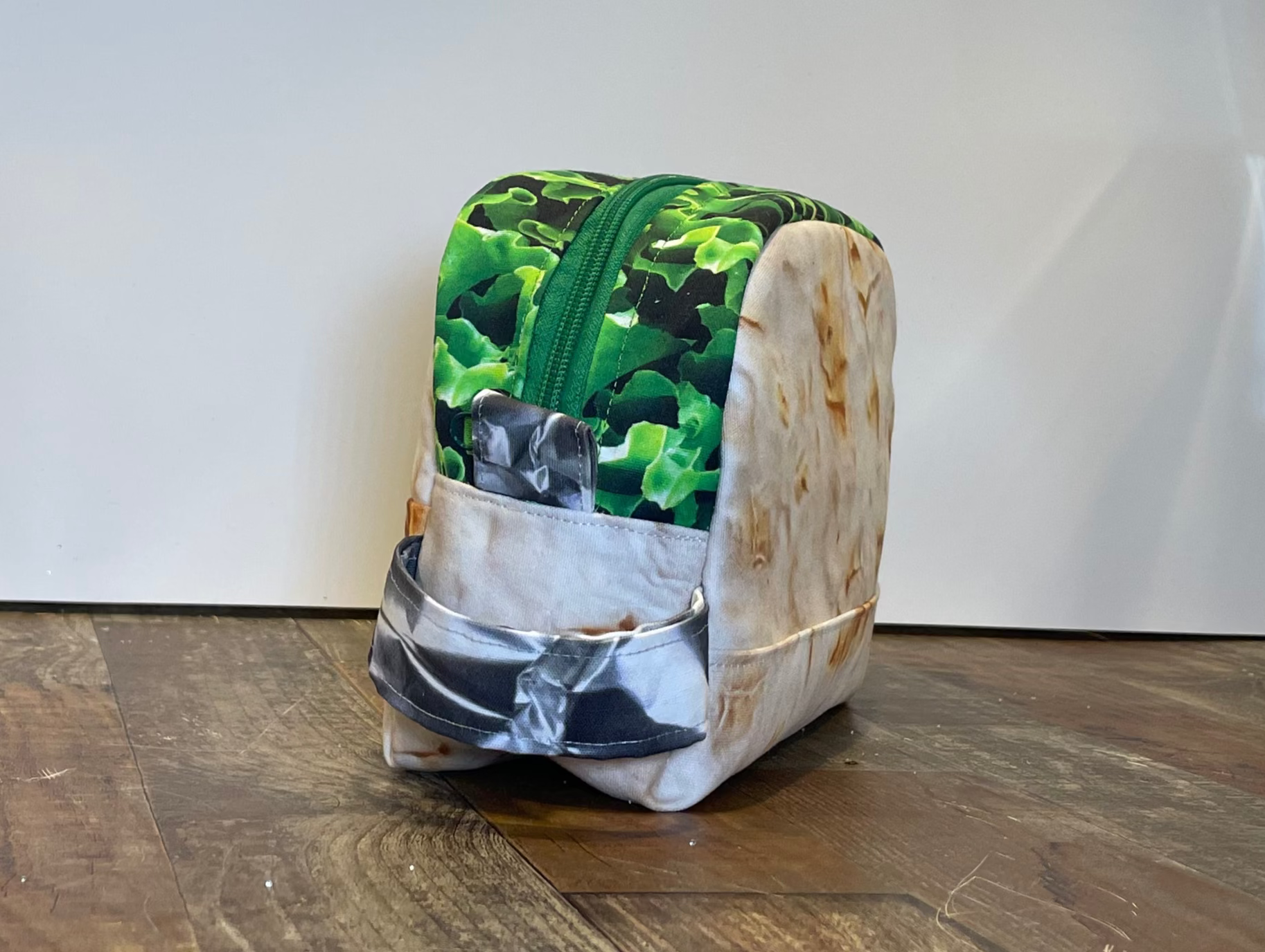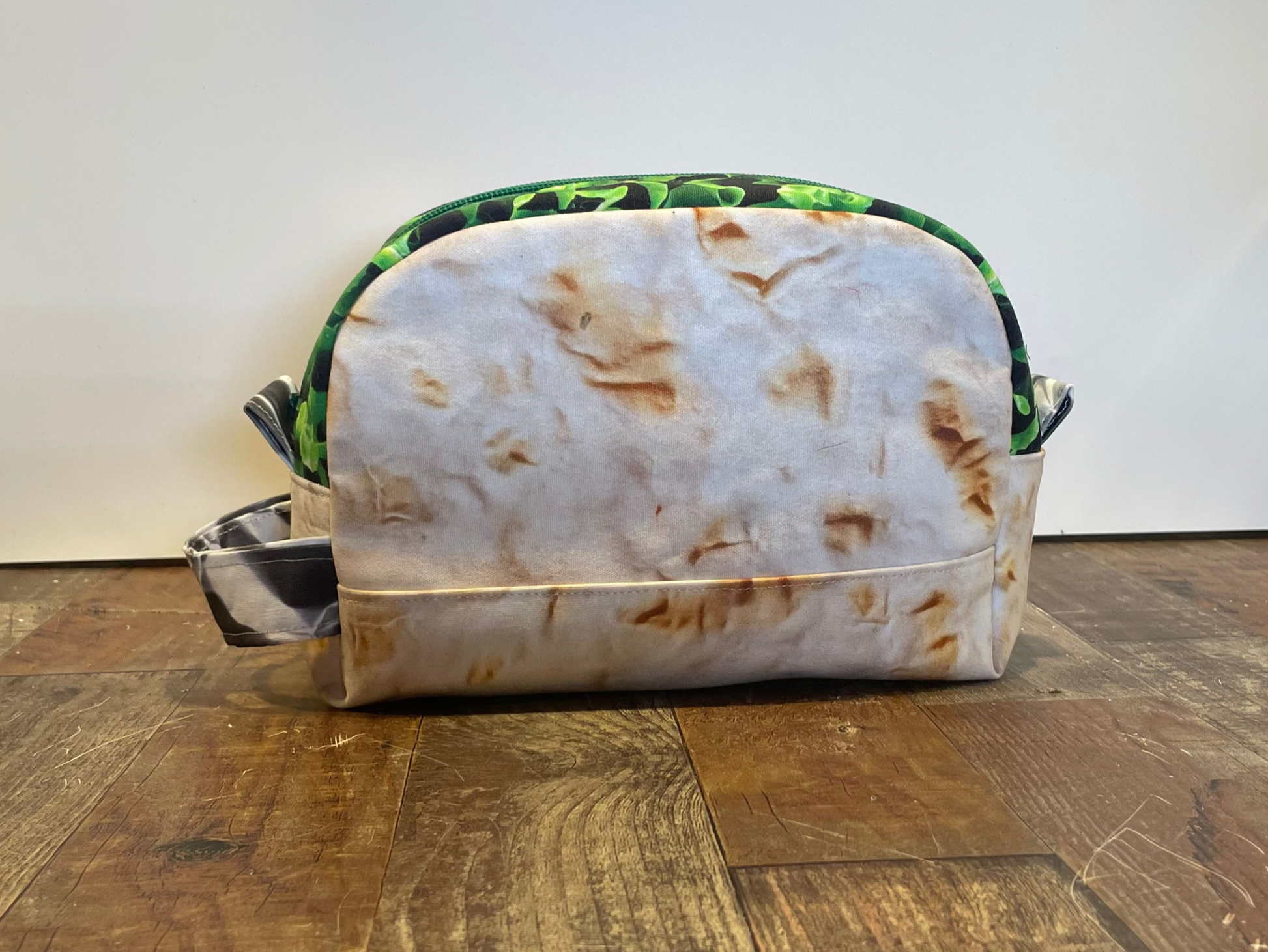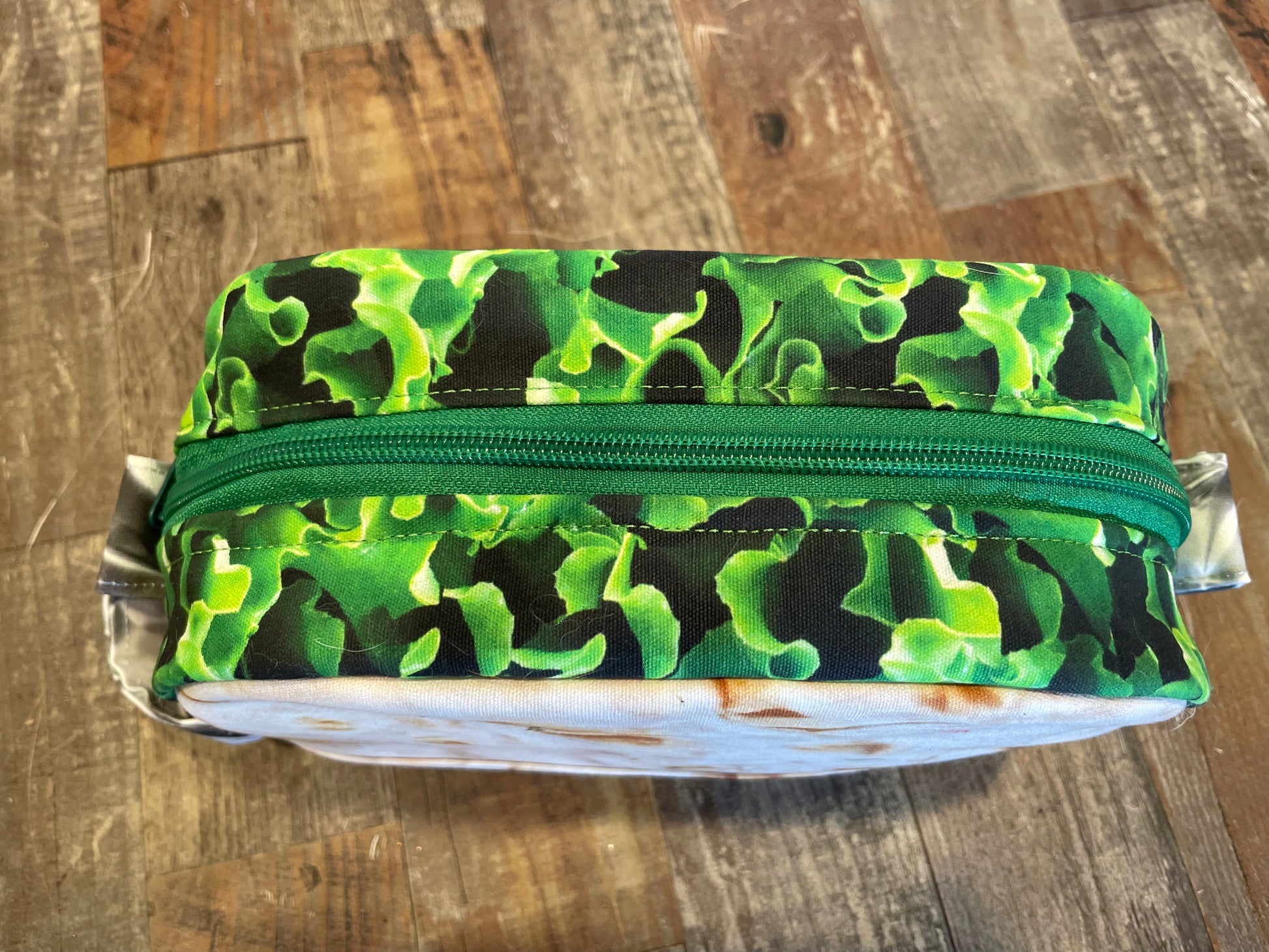 That's a big taco! Medium-sized bag, but holds a whole lot! Tortilla exterior, lettuce zipper area, and aluminum foil handle are interfaced cotton canvas, so it holds its shape. Interior salsa print and avocado slip pocket are quilting cotton. Caution: may cause hunger!