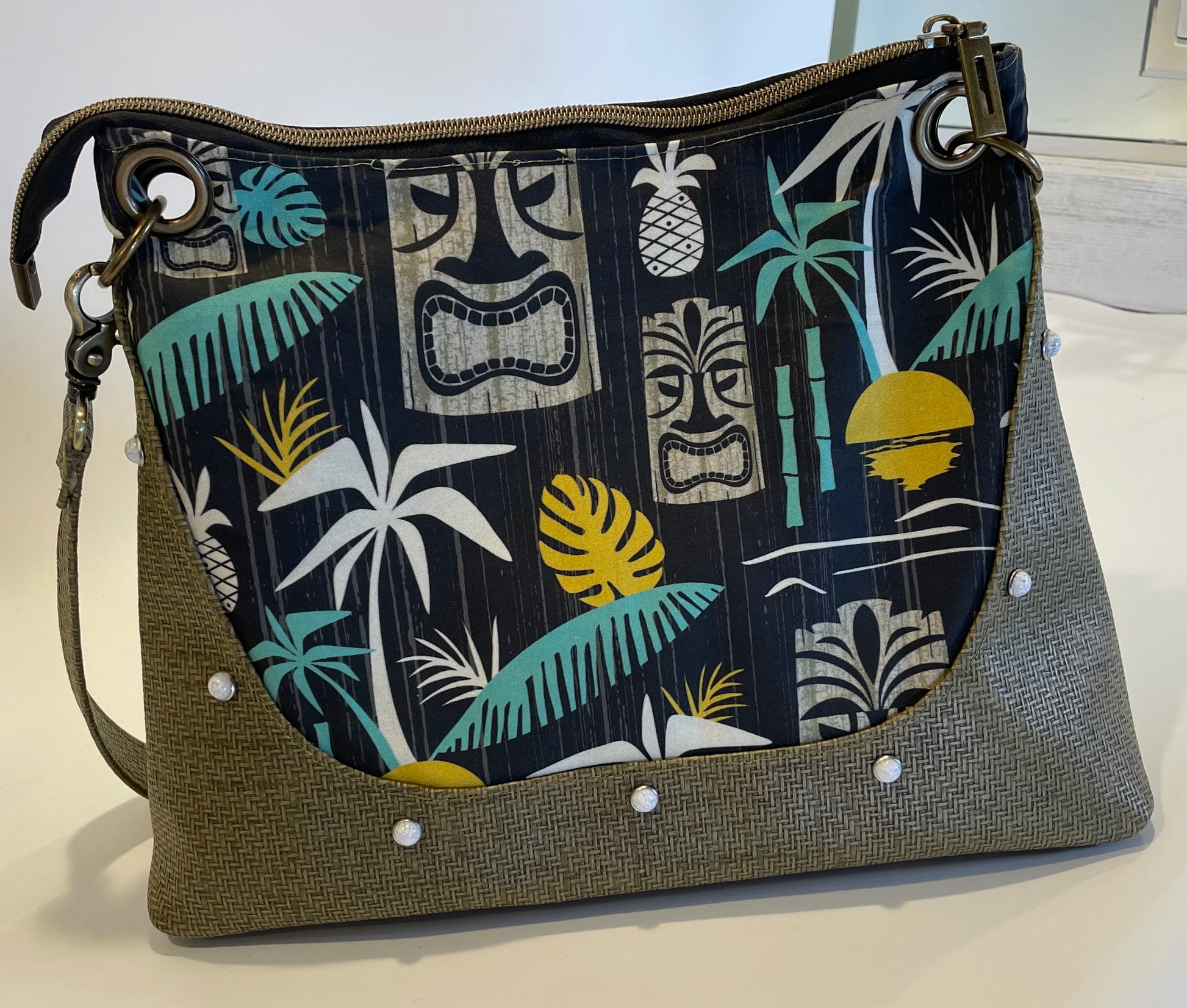 An ode to tiki culture in shoulder bag form! Designer fabric from Spoonflower, accentuated by a thatched textured vinyl. “Coconut”rivets add the finishing touch! Plenty of storage inside, including a deep, wide zipper pocket, as well as a dual slip pocket. Aloha!